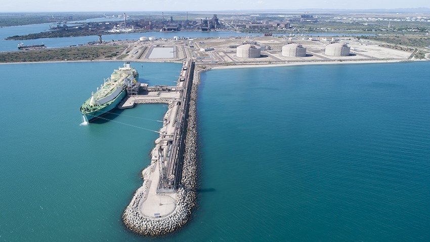 - Les navires méthaniers sont réceptionnés et le gaz est déchargé sous forme liquide, grâce à des bras articulés qui viennent se brancher sur les cuves du méthanier.